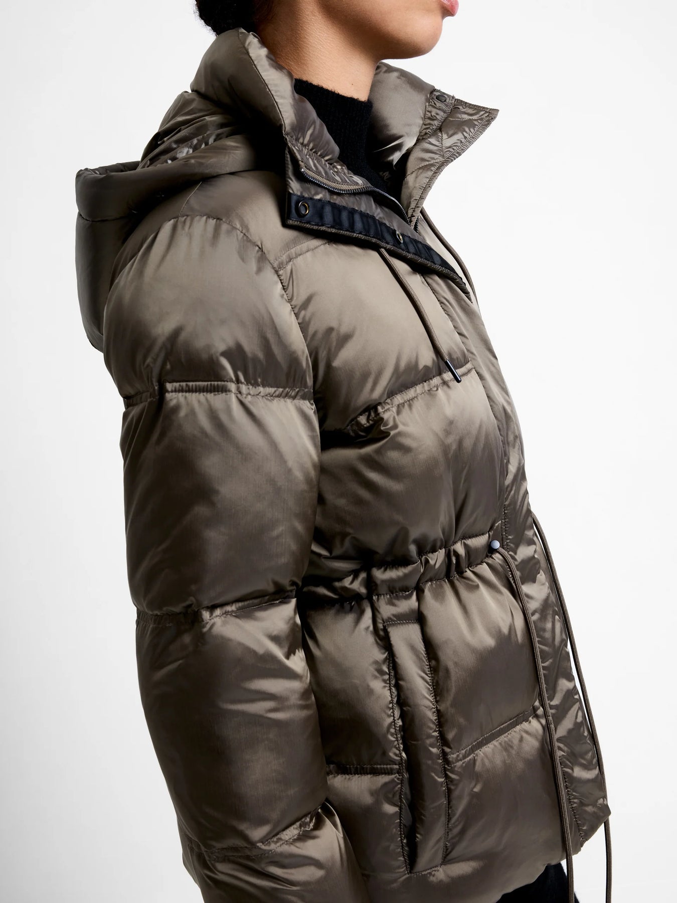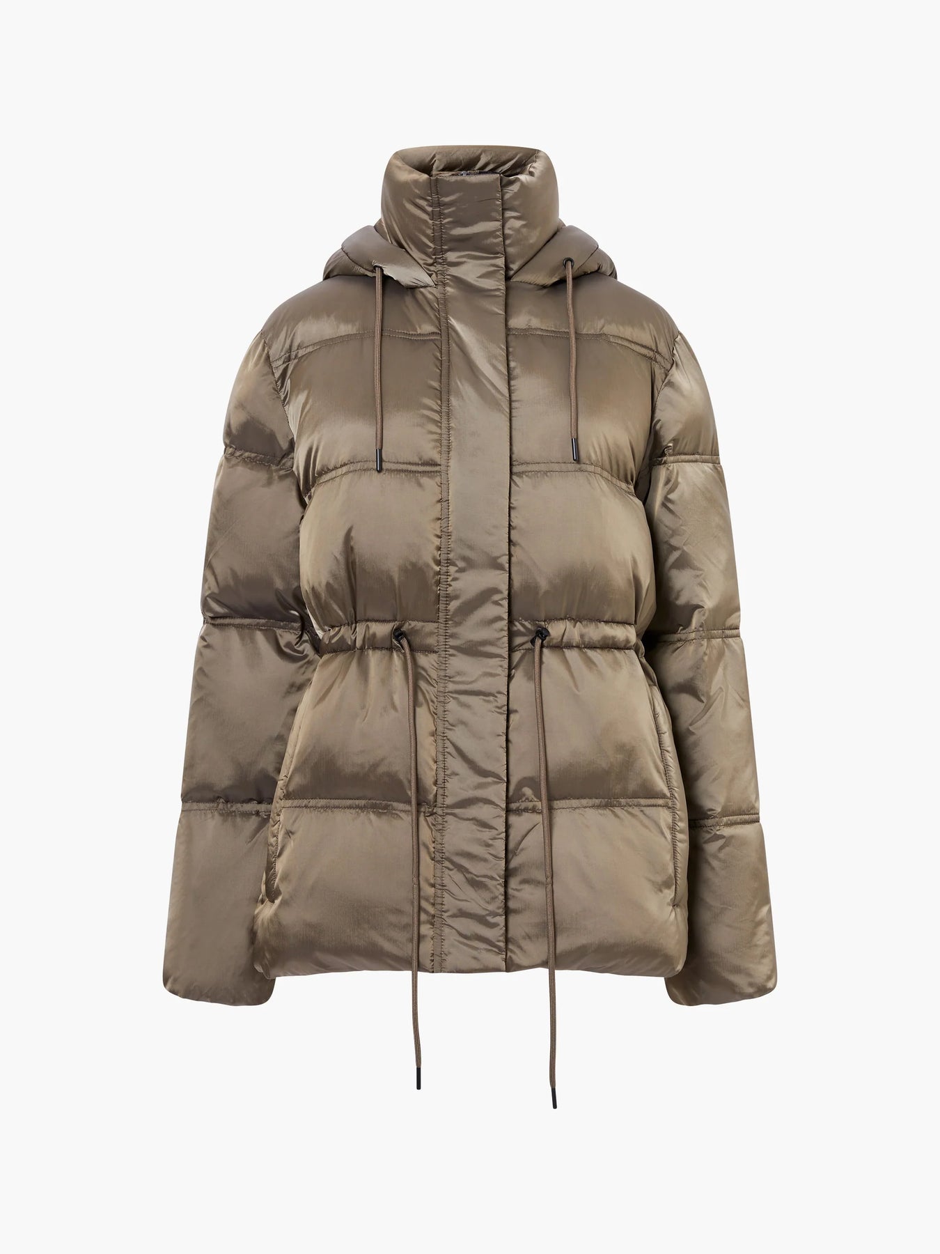 70ZAB Kendra nylon puffer jacket with glossy finish and drawstring tie waist.