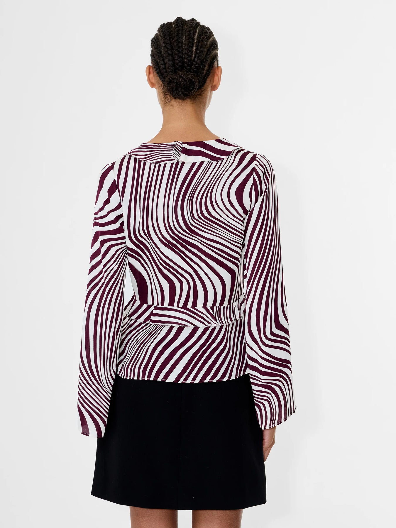 72ZCV neck printed ruffle blouse with front buttons and self tie